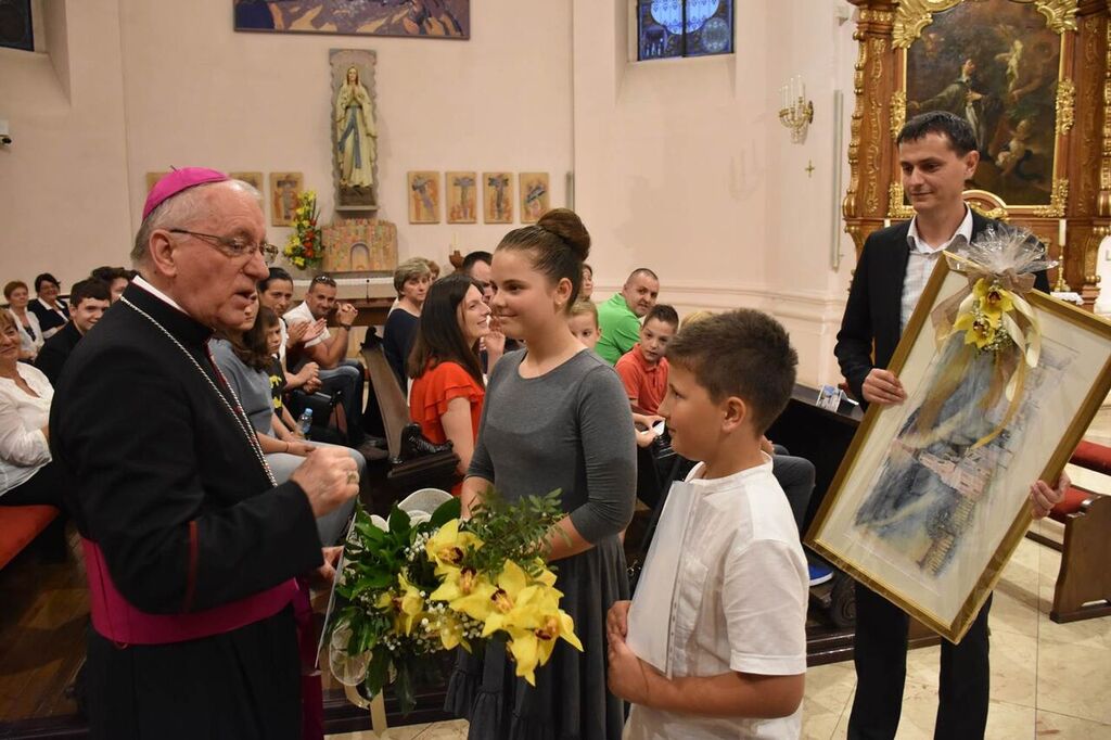 Na koncu programa Bartol Morvaj, učenik Katoličke osnovne škole u Požegi, pročitao je biskupu imendansku čestitku i zahvalu što prati i potiče Školu, a potom mu je ravnatelj Frano Barišić uručio prigodni poklon.