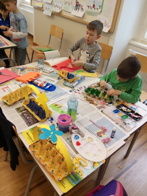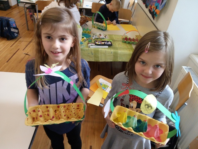 Učenici produženoga boravka prvoga razreda, s učiteljicom Barbarom Tus-Sedlar, jako se raduju bojanju jaja sa svojim roditeljima uoči Uskrsa. No, kako bi oni ta svoja obojena jaja imali gdje stavili, izradili su prigodne i vesele košarice za jaja iskoristivši pritom bakine stare kartonske kutije za jaja.