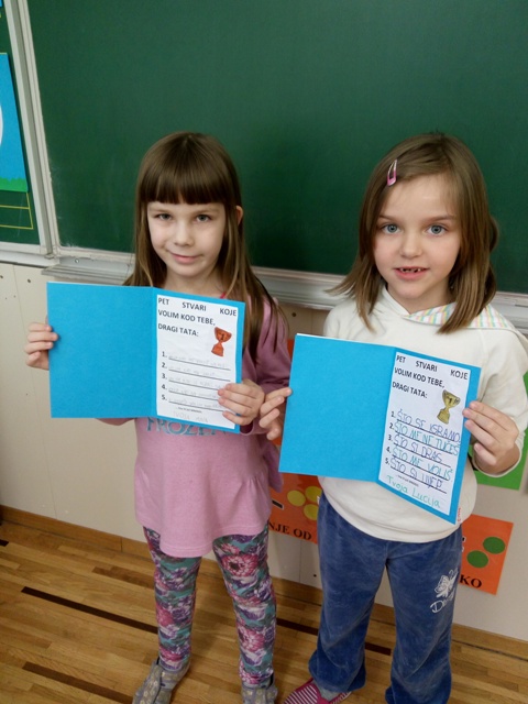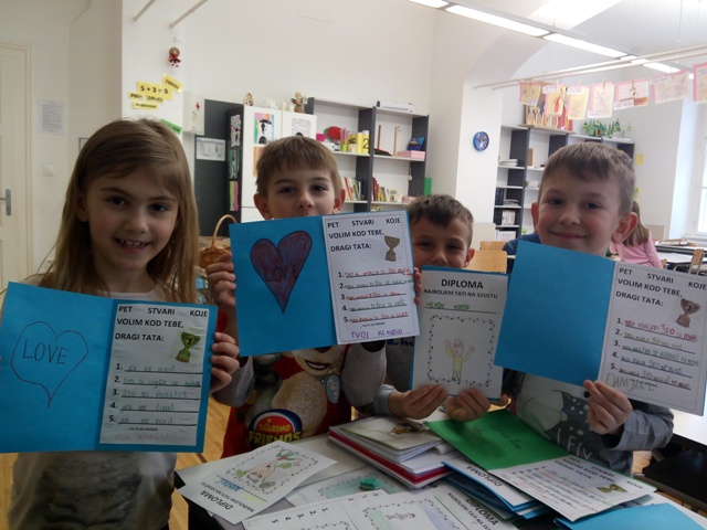 Nakon što su svoj razred ukrasili prigodnim radovima povodom skore svetkovine sv. Josipa te ujedno i Danom očeva, učenici produženoga boravka prvoga razreda, s učiteljicom Barbarom Tus-Sedlar odlučili su izradili diplome kojima će svojim tata pokazati zašto ih toliko vole te im uručiti priznanje kako su za njih oni najbolji očevi na svijetu.