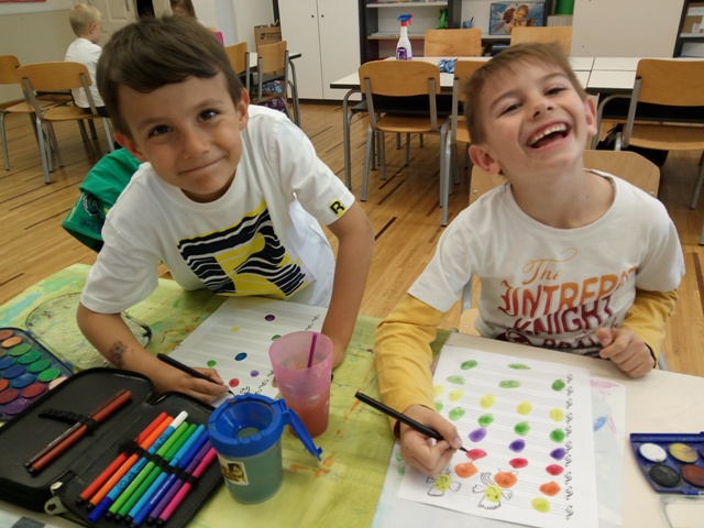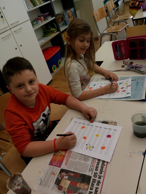 Note, glazba, ples- teme su o kojima, ovih dana, detaljnije promišljaju učenici prvoga razreda produženoga boravka sa svojom učiteljicom Barbarom Tus-Sedlar. Kako bi povezali likovni i glazbu, odlučili su izmisliti svoje note. Uz vodene boje, otiske prstiju i crni flomaster nastale su šarene i vesele note produženoga boravka.