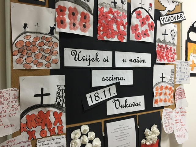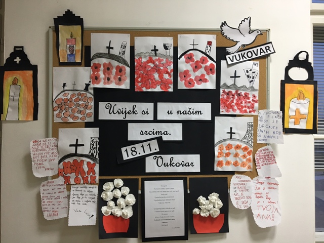 Kako bi to uistinu i bilo tako, učenici produženoga boravka drugoga i trećega razreda, sa svojom učiteljicom Barbarom Drežnjak, cijeli se tjedan upoznaju s događanjima Vukovara. Povezuju iz sa svojim likovnim radovima, pjesmama, čitanjima, igrama, stvaralačkim pisanjima... Vukovar 1991. Ima gradova od kojih ne osta niti znamen Ima gradova od kojih ostade samo ime urezano u kamen Ima gradova koji zrače svjetlošću zvijezda Ima gradova koji pružaju utočište i toplinu gnijezda Ima gradova koji su mržnji zatvorili vrata Ima gradova kojima je sloboda draža od zlata Ima gradova koji će se iz pepela ponovno roditi Ima gradova koje će ljubav i hrabrost osloboditi Ima jedan grad koji je hrabrošću nadmašio sebe i sve naše snove Zbog njega se sloboda Vukovar zove Tin Kolumbić