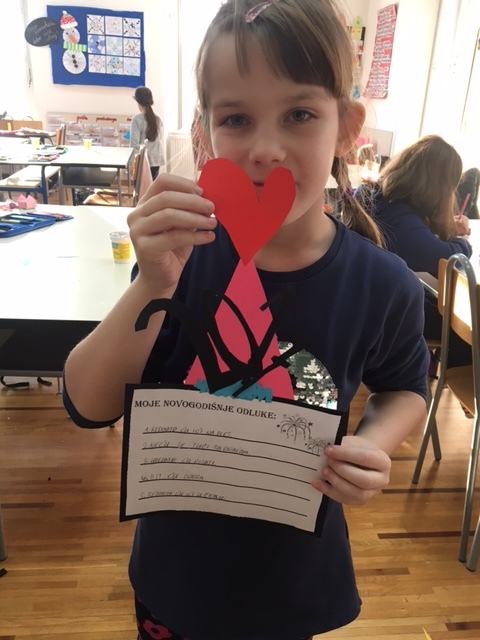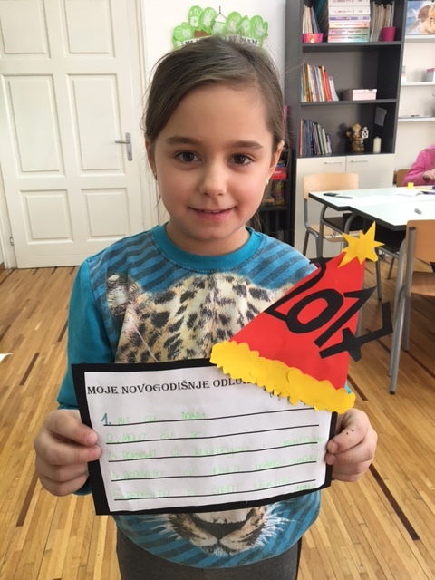 Učenici produženoga boravka drugoga i trećega razreda, s osmijehom, puni novih doživljaja, ušetali su u učionicu produženoga boravka. Najprije su se prisjetili svoga zimskog odmora, prepričali ga, a potom i likovno prikazali sebi najdraži događaj s praznika. Potom je uslijedio razgovor o novoj 2017. godini u kojoj se nalazimo, o velikim bezuspješnim novim odlukama starijih, ali i tome što bi mi to mogli promijeniti u ovoj godini te kako biti bolji. Uz pomoć kolaž papira, škara, ljepila i flomastera, učenici su sa svojom učiteljicom Barbarom Drežnjak, izradili listu svojih novogodišnjih odluka.