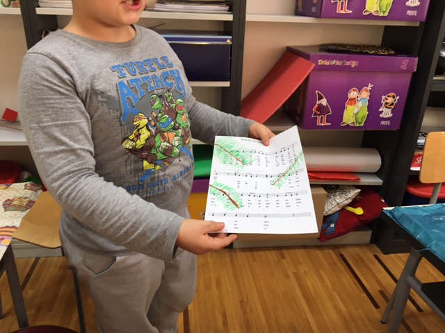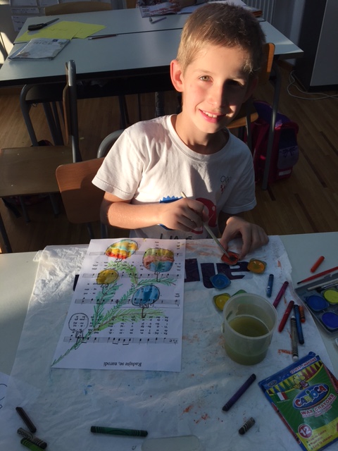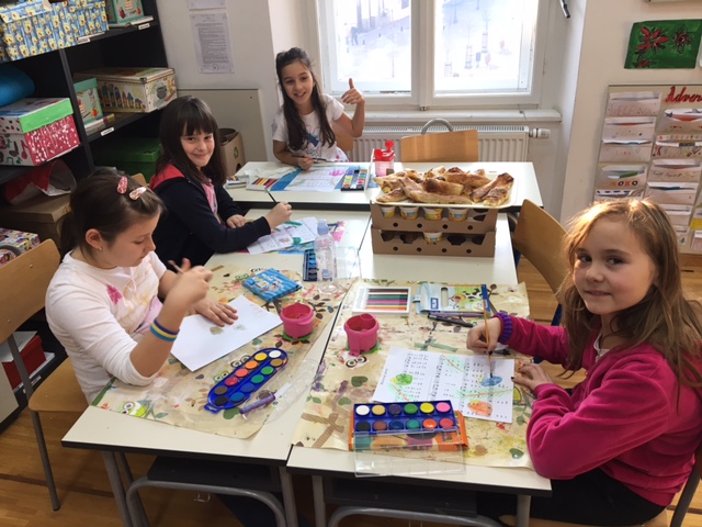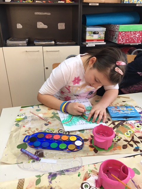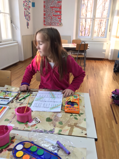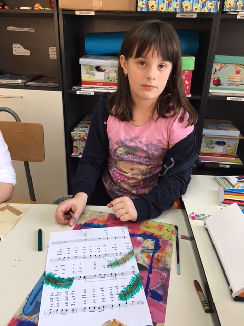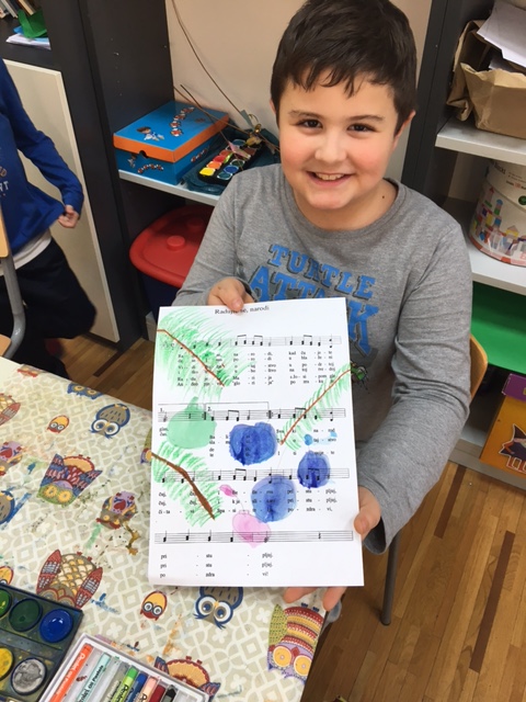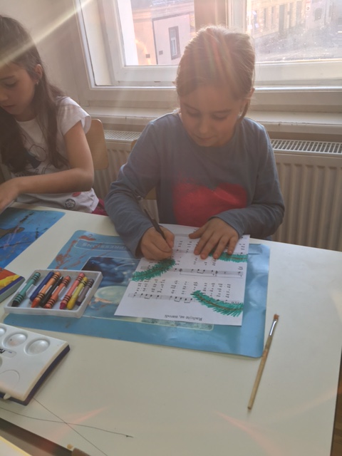 Učenici produženoga boravka drugoga i trećega razreda, sa svojom učiteljicom Barbarom Drežnjak, nastavili su s božićnim uređenjem razreda. Ovaj put su odlučili uzeti drugačiju pozadinu za njihov likovni rad- glazbenu pozadinu. Uzeli su papire s notama svima nam poznate pjesme- Radujte se narodi te na njemu uz pomoć masnih te vodenih boja načini kuglice- vesele i raspjevane.