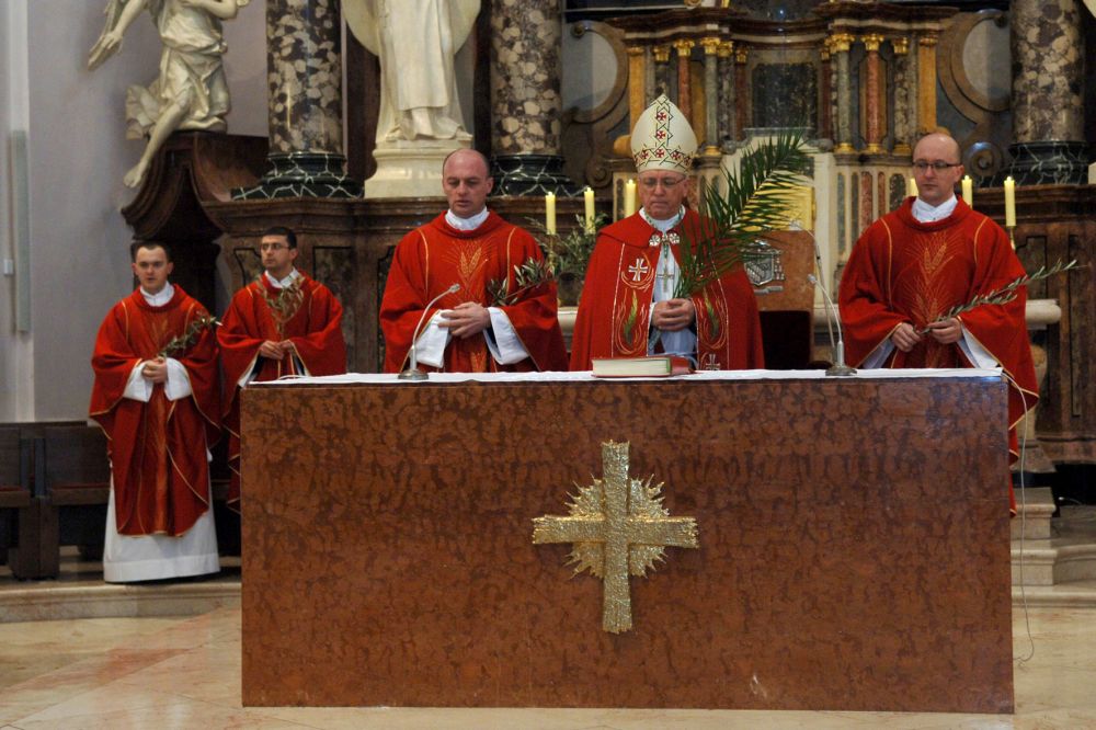 Slavlje je započelo u crkvi sv. Lovre gdje je biskup djeci i drugima nazočnima rekao: „Nedjelja je muke Gospodnje ili Cvjetnica. Diljem svijeta kršćani se okupljanju oko Isusa Krista da bi razmatrali njegov slavni ulazak u Jeruzalem, njegovu osudu, muku i smrt koju je za nas podnio. Oni koju su mu klicali „hosana“, nakon nekoliko dana vikali su „raspni ga“. To je izazov i za nas. Mi mu u procesiji od crkve sv. Lovre do Katedrale želimo sa svom iskrenošću srca klicati „hosana“, i ujedno ga moliti da nam pomogne kako mu ne bismo nikada izrekli svoju osudu, izbacili ga iz svoga života, nego da ga usvojimo kao onoga koga volimo i koji osmišljava sve naše patnje pa i smrt.“ Potom je uslijedio obred blagoslova maslinovih grančica i navještaj evanđelja o Isusovu ulasku u Jeruzalem, nakon čega su se vjernici u procesiji uputili u Katedralu gdje je nastavljeno slavlje. Evanđeoski navještaj muke po Luki pjevali su članovi katedralnog zbora sa solistima Robertom Mokrim, Tomislavom Jurićem i Tonkom Jakobovićem.