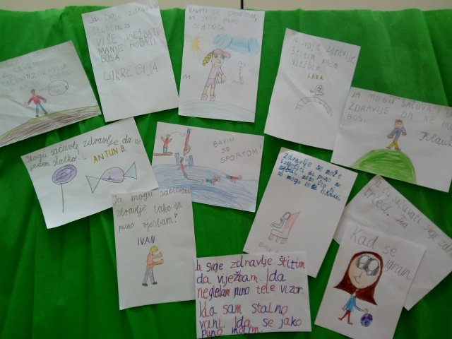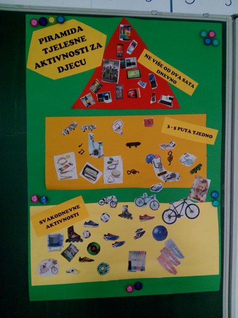 7. travnja obilježavamo Svjetski dan zdravlja, osim povećane tjelesne aktivnosti, učenici produženoga boravka prvoga razreda, sa svojom učiteljicom Barbarom Tus-Sedlar, odlučili su o zdravlju naučiti više. Nakon čitanja i istraživanja te samostalnog zapisivanja što mogu činiti za svoje zdravlje, izradili su piramidu tjelesnih aktivnosti koristeći stare letke. Na taj su način ponovili što to njima treba biti svakodnevna aktivnost, što tjedna, a što u svome danu trebaju imati ograničeno te u jako malim količinama. Sretni te Bogu zahvalni na svome zdravlju, dali su obećanje kako će sve danas naučeno, uvijek imati na umu.