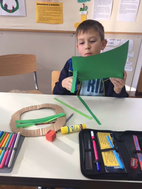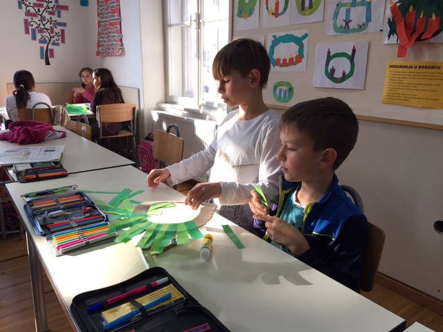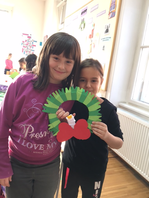 Učenici produženoga boravka drugoga i trećega razreda nastavljaju sa svojim adventskim uređenjem razreda. Sa svojom učiteljicom Barbarom Drežnjak jučer su uz pomoć kartona, kolaž papira i svojih vještih prstića izradili adventske vijence za vrata.