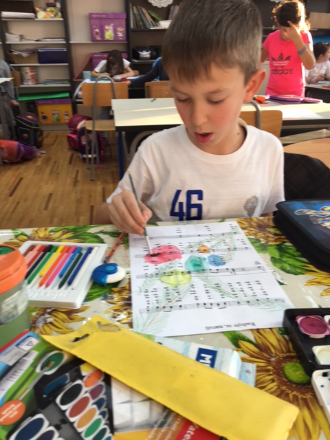 Učenici produženoga boravka drugoga i trećega razreda, sa svojom učiteljicom Barbarom Drežnjak, nastavili su s božićnim uređenjem razreda. Ovaj put su odlučili uzeti drugačiju pozadinu za njihov likovni rad- glazbenu pozadinu. Uzeli su papire s notama svima nam poznate pjesme- Radujte se narodi te na njemu uz pomoć masnih te vodenih boja načini kuglice- vesele i raspjevane.